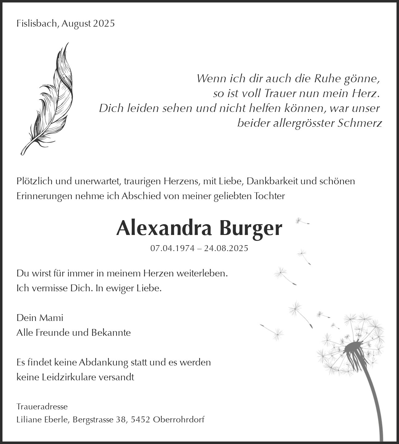 Traueradresse Liliane Eberle, Bergstrasse 38, 5452 Oberrohrdorf