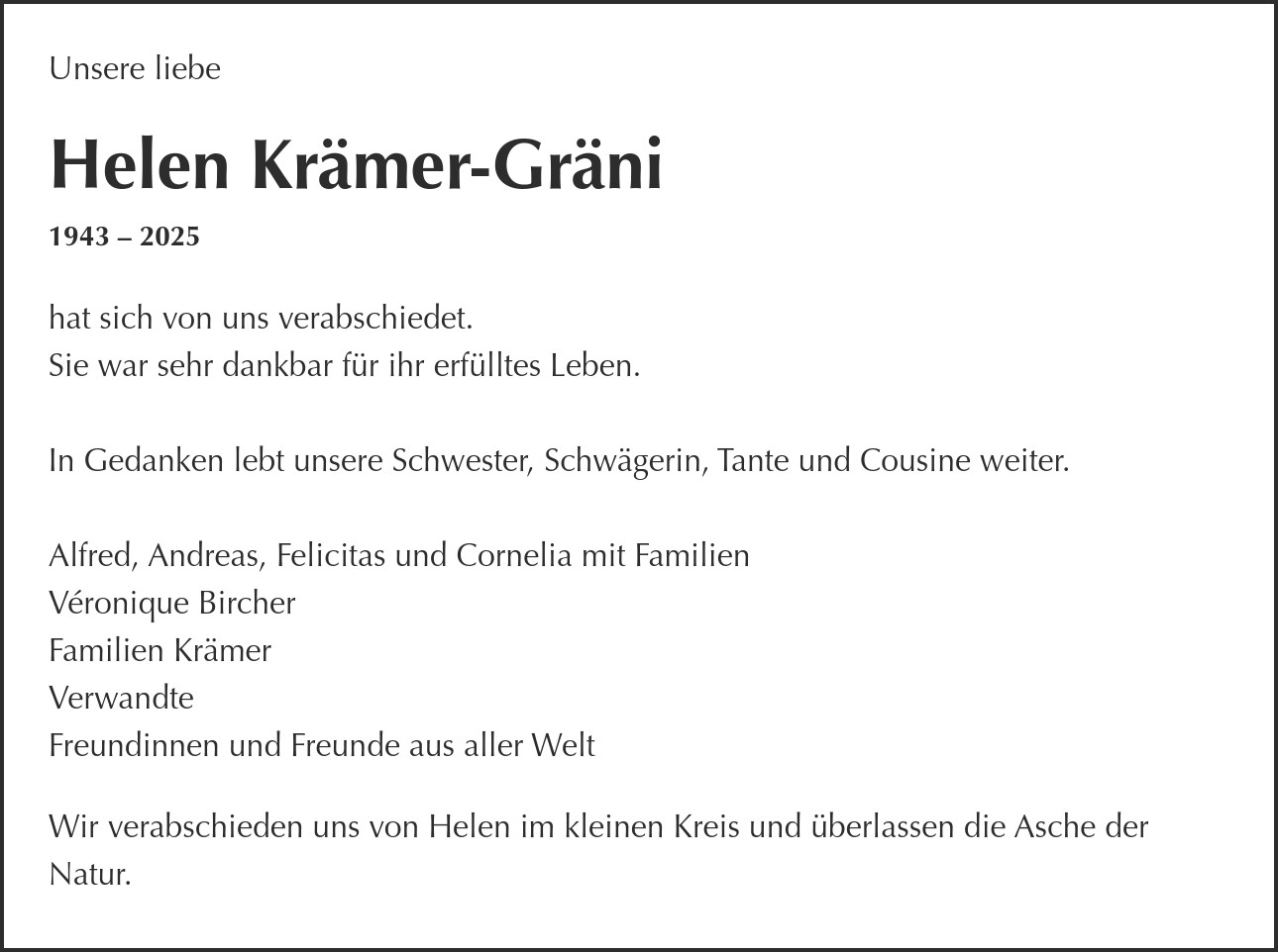 hat sich von uns verabschiedet. Sie war sehr dankbar für ihr erfülltes Leben. In Gedanken lebt unsere Schwester, Schwägerin, Tante und Cousine weiter. Alfred, Andreas, Felicitas und Cornelia mit Familien Véronique Bircher Familien Krämer Verwandte Freundinnen und Freunde aus aller Welt