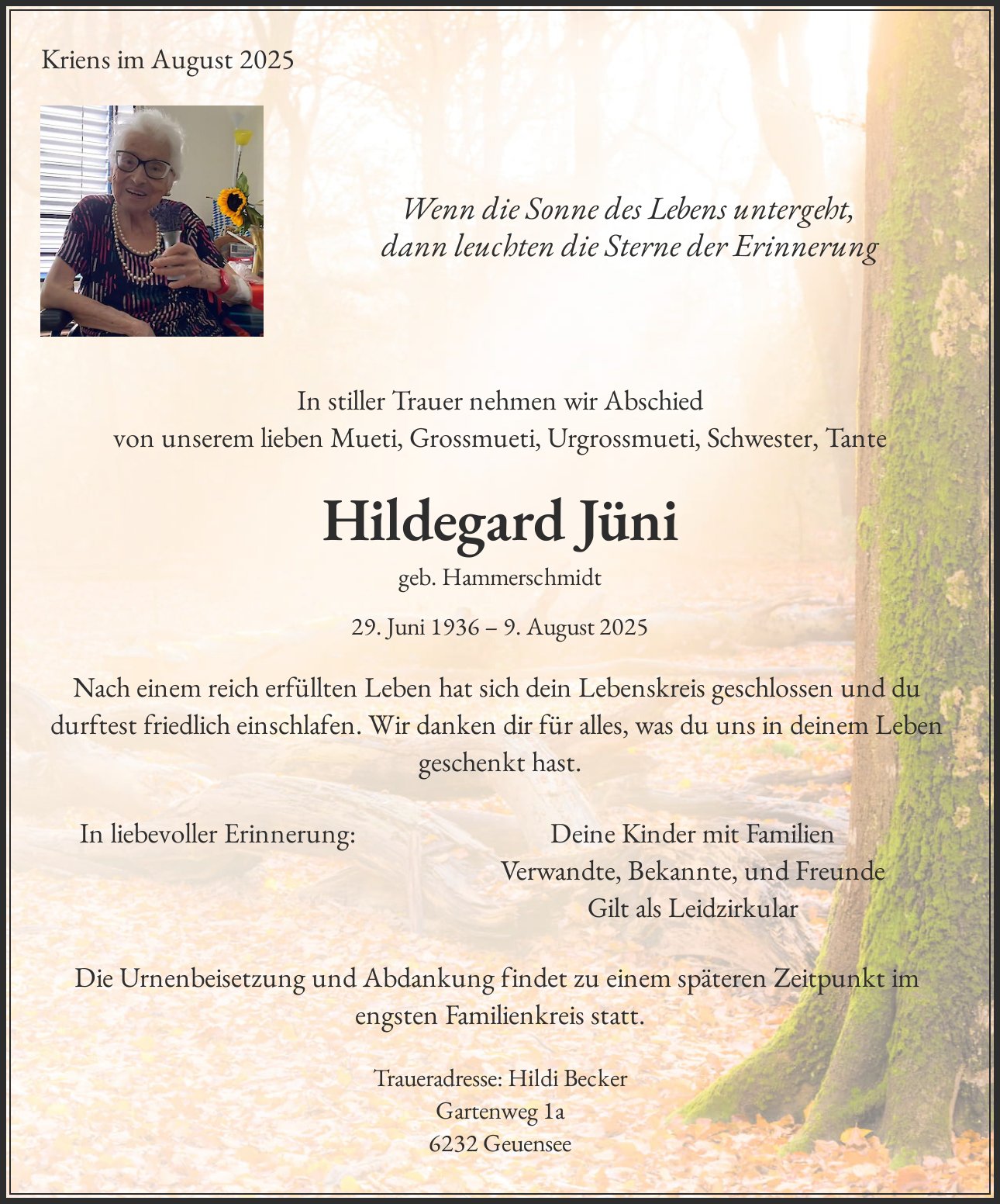 Traueradresse: Hildi Becker Gartenweg 1a 6232 Geuensee