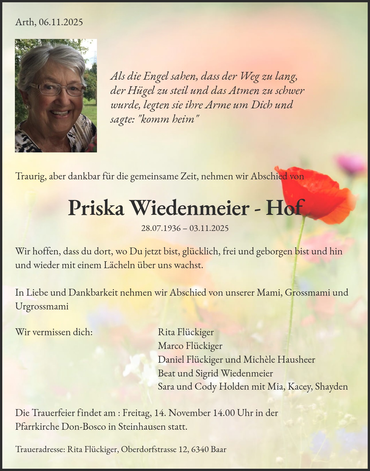 Die Trauerfeier findet am : Freitag, 14. November 14.00 Uhr in der Pfarrkirche Don-Bosco in Steinhausen statt.