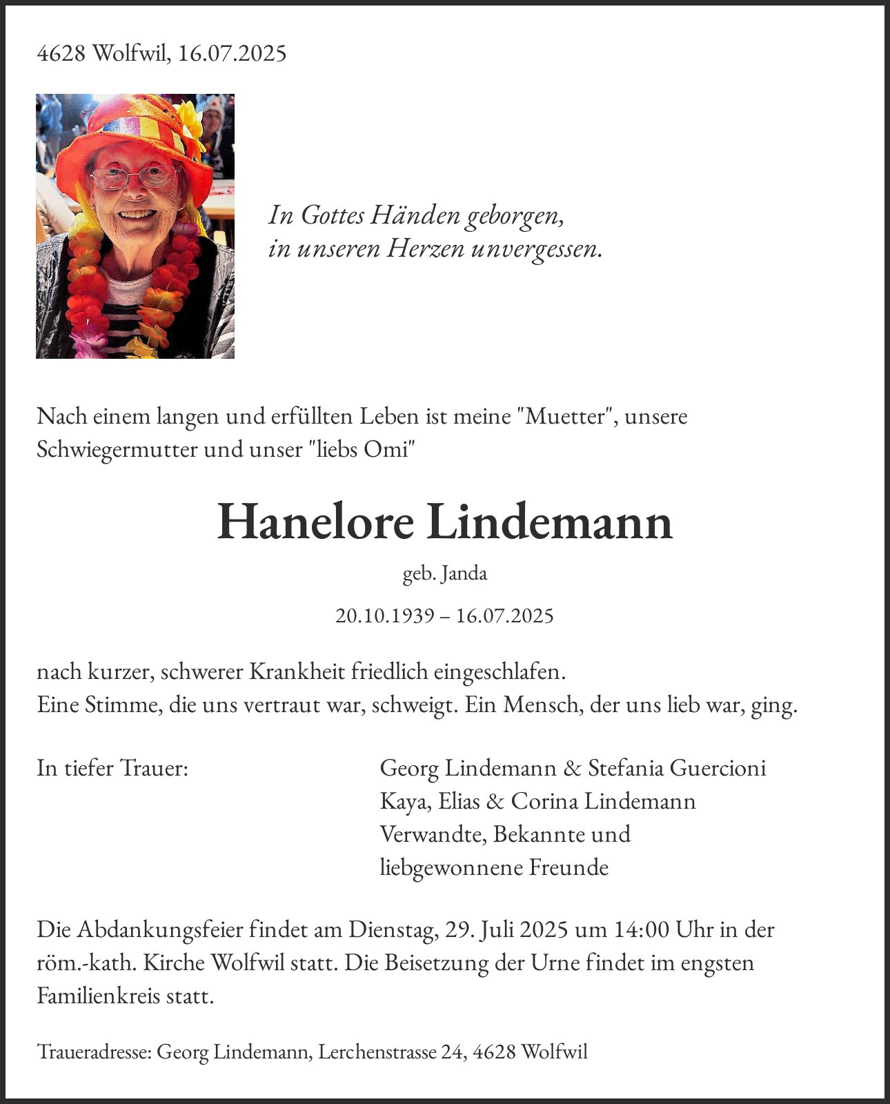 Traueradresse: Georg Lindemann, Lerchenstrasse 24, 4628 Wolfwil