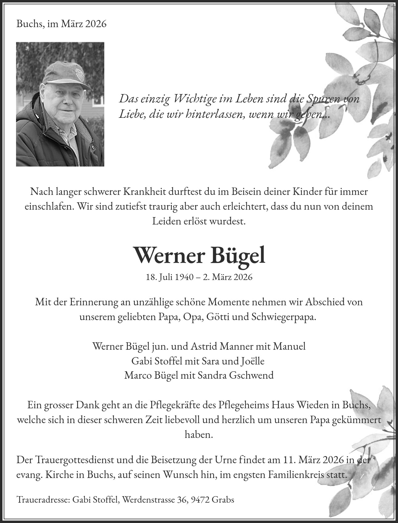 Mit der Erinnerung an unzählige schöne Momente nehmen wir Abschied von unserem geliebten Papa, Opa, Götti und Schwiegerpapa. Werner Bügel jun. und Astrid Manner mit Manuel Gabi Stoffel mit Sara und Joëlle Marco Bügel mit Sandra Gschwend Ein grosser Dank geht an die Pflegekräfte des Pflegeheims Haus Wieden in Buchs, welche sich in dieser schweren Zeit liebevoll und herzlich um unseren Papa gekümmert haben.