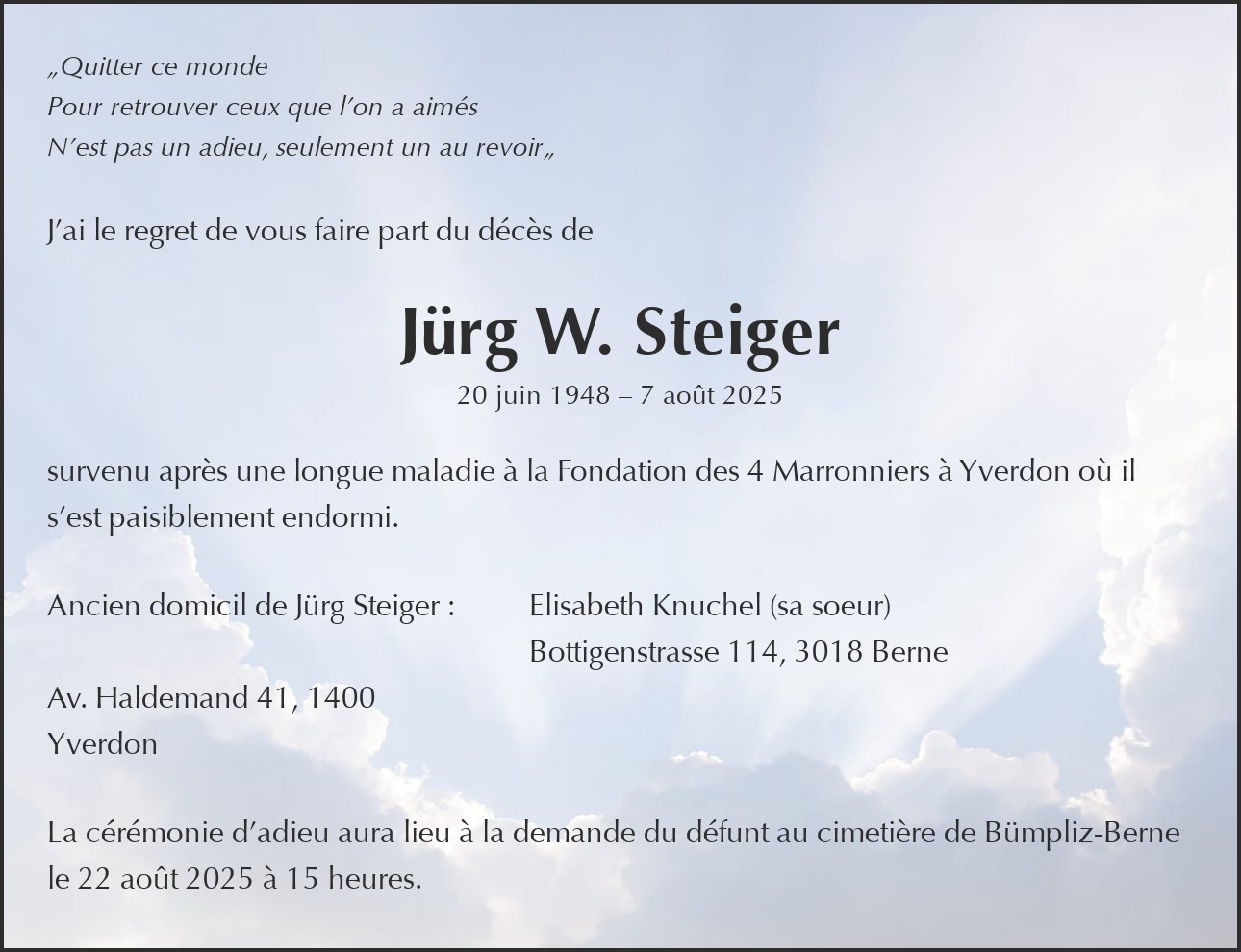 La cérémonie d’adieu aura lieu à la demande du défunt au cimetière de Bümpliz-Berne le 22 août 2025 à 15 heures.