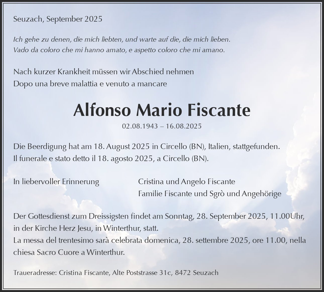 Der Gottesdienst zum Dreissigsten findet am Sonntag, 28. September 2025, 11.00Uhr, in der Kirche Herz Jesu, in Winterthur, statt. La messa del trentesimo sarà celebrata domenica, 28. settembre 2025, ore 11.00, nella chiesa Sacro Cuore a Winterthur.