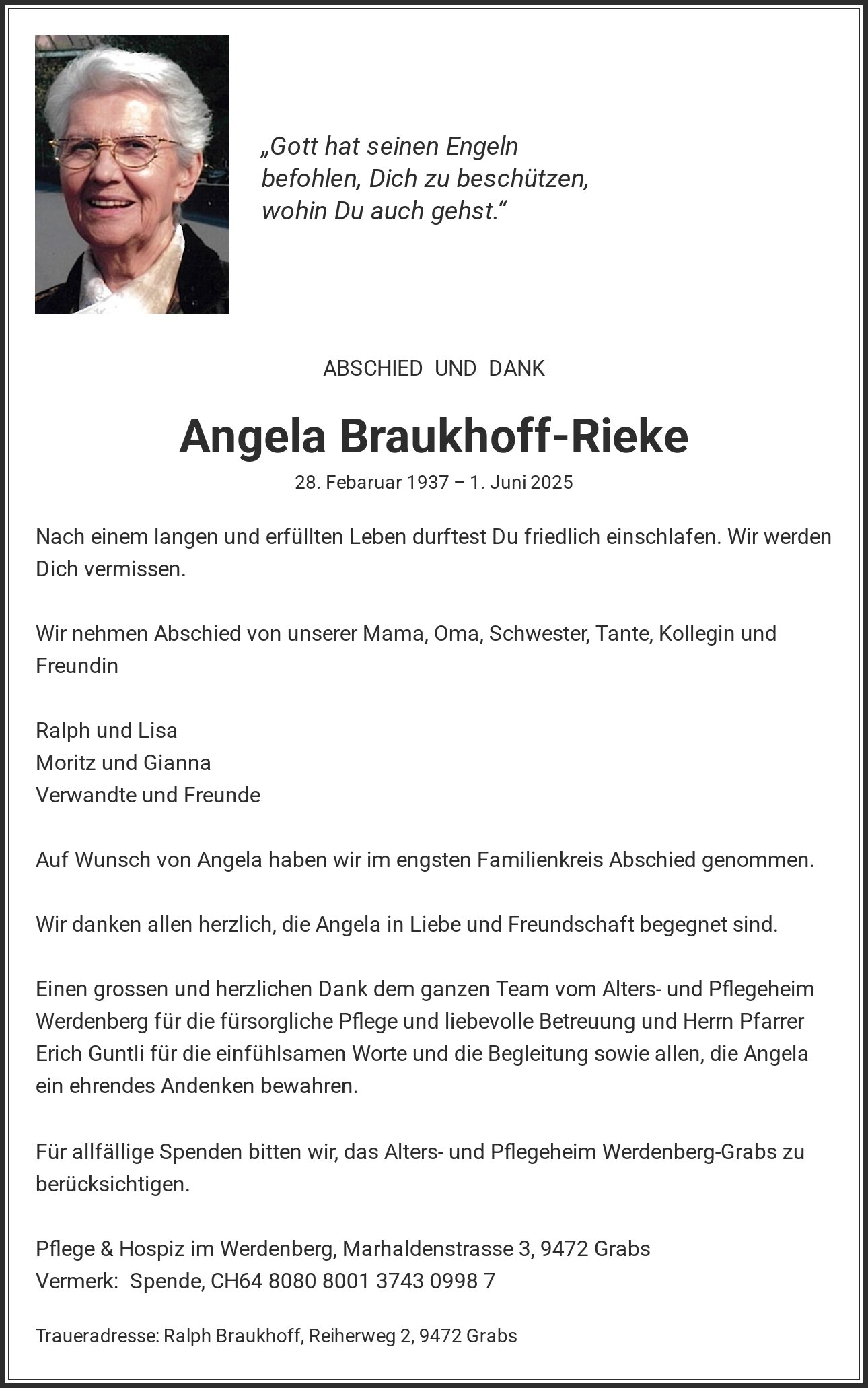 Traueradresse: Ralph Braukhoff, Reiherweg 2, 9472 Grabs