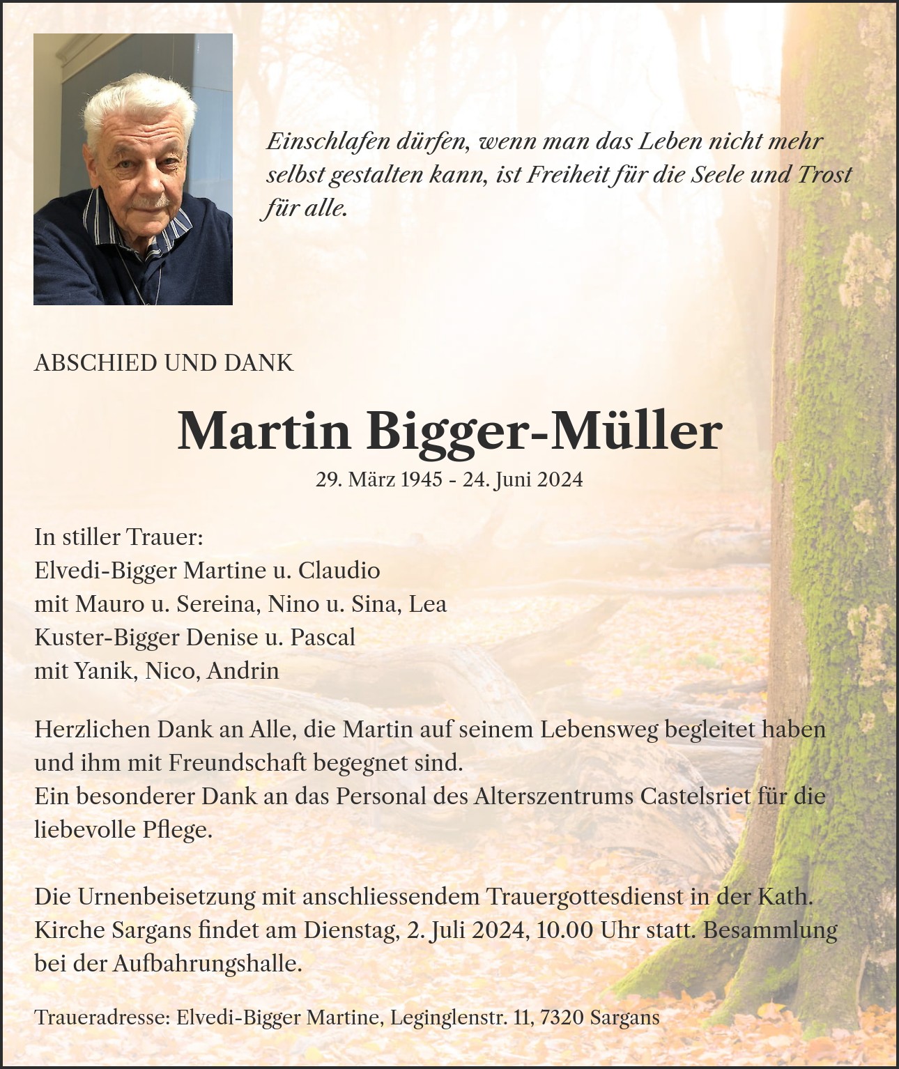 Traueradresse: Elvedi-Bigger Martine, Leginglenstr. 11, 7320 Sargans