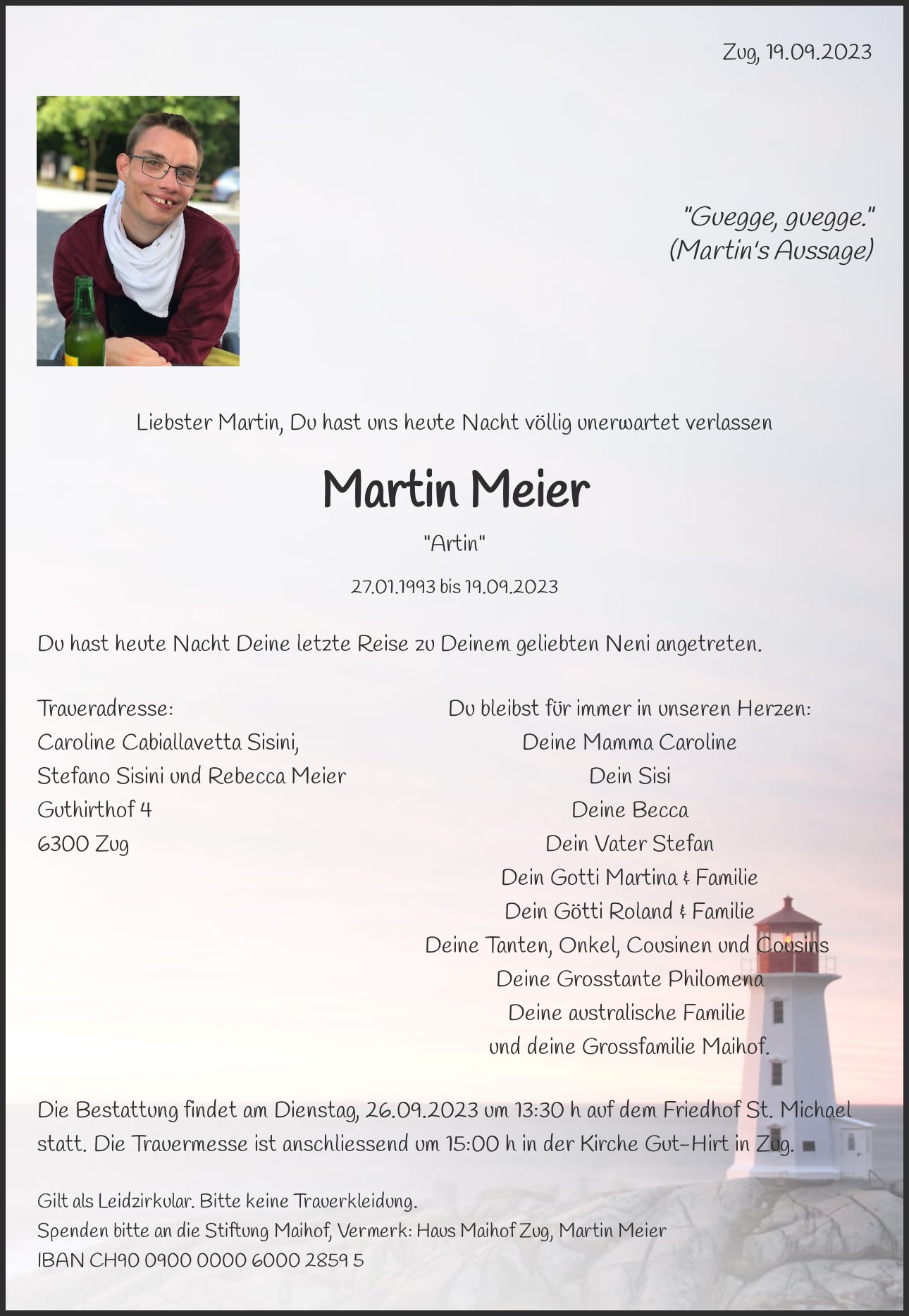 Gilt als Leidzirkular. Bitte keine Trauerkleidung. Spenden bitte an die Stiftung Maihof, Vermerk: Haus Maihof Zug, Martin Meier IBAN CH90 0900 0000 6000 2859 5