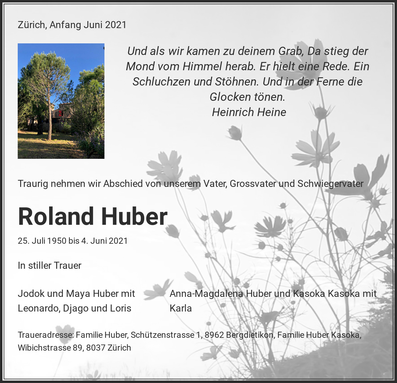 Traueradresse: Familie Huber, Schützenstrasse 1, 8962 Bergdietikon, Familie Huber Kasoka, Wibichstrasse 89, 8037 Zürich