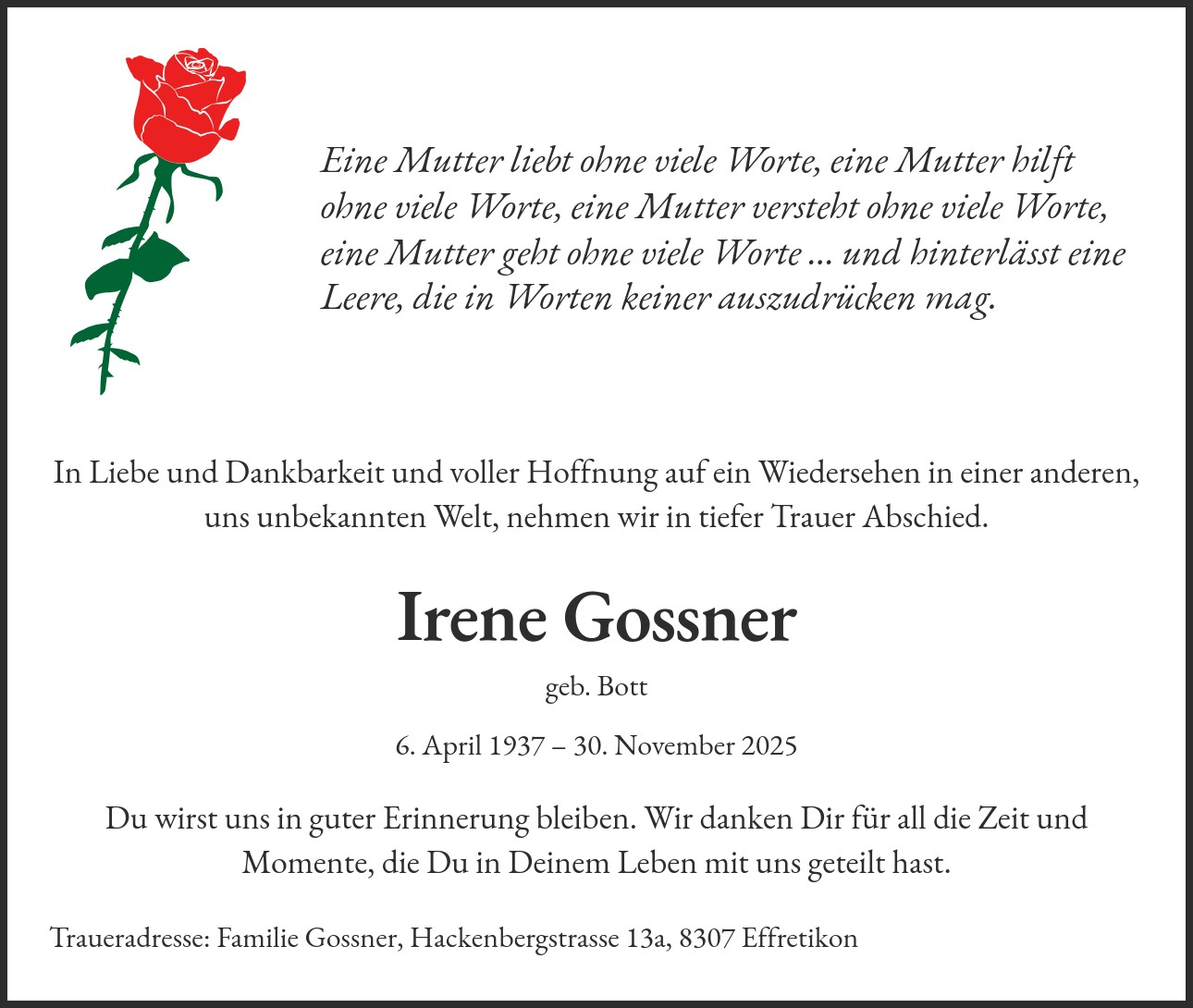 Traueradresse: Familie Gossner, Hackenbergstrasse 13a, 8307 Effretikon